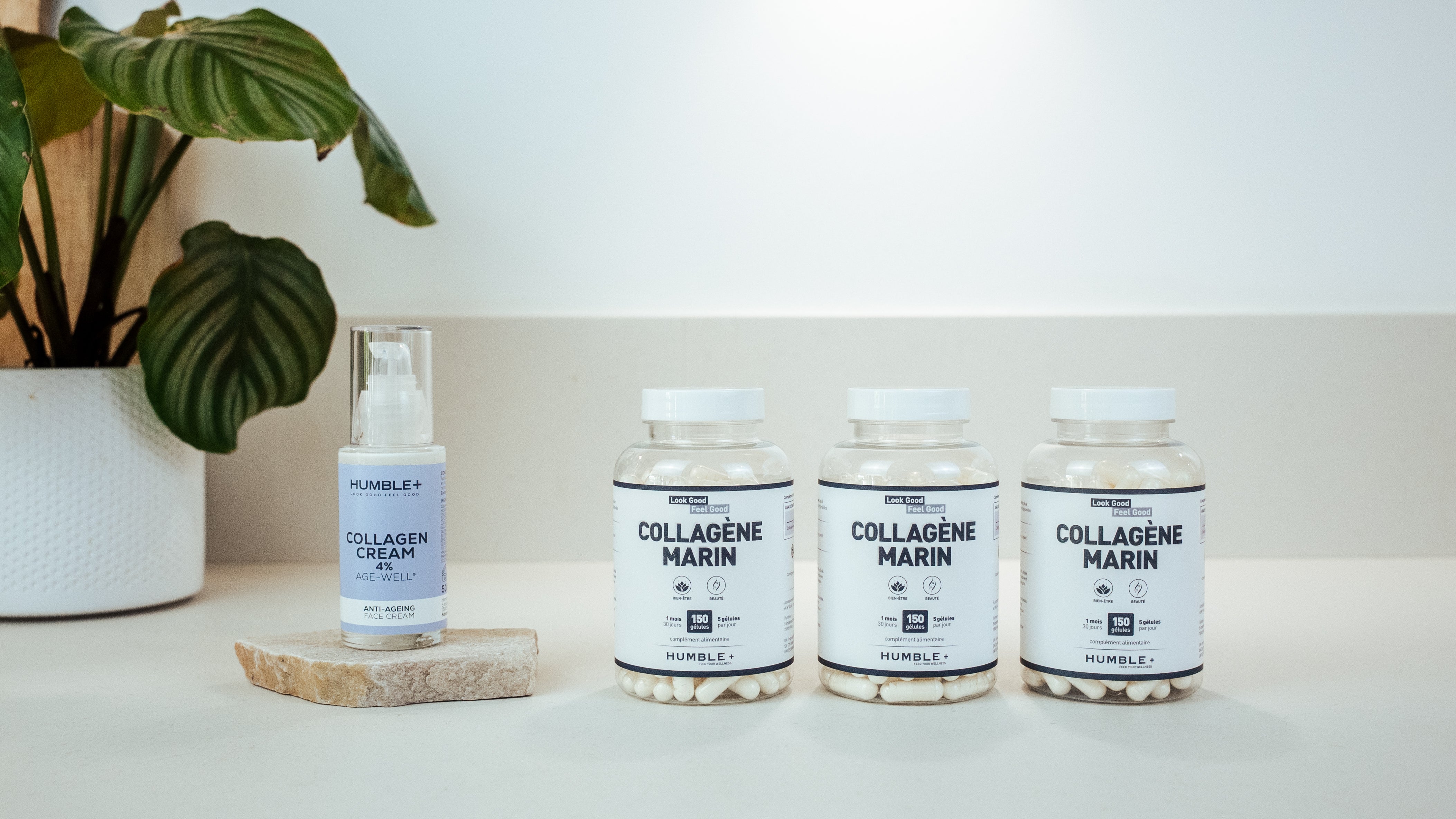 Chez Humble+, on a réuni les deux actifs essentiels pour accompagner cette étape naturelle : le collagène marin français en gélules, concentré pour soutenir la beauté de la peau, et la créatine monohydrate pure, pour préserver la force et soutenir l’équilibre.
