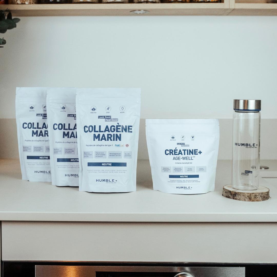 Chez Humble+, on a réuni les deux actifs essentiels pour ralentir ces effets naturels : le collagène marin français, la créatine monohydrate pure.